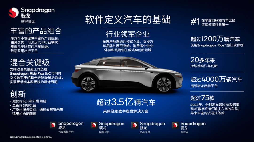 高通骁龙数字底盘概念车,展现汽车端生成式AI所实现的智能应用。据悉,目前已有超3.5亿辆汽车采用了高通的骁龙数字底盘解决方案,超过4000万辆汽车搭载骁龙座舱平台。高通方面称,骁龙座舱平台已具备支持生成式AI的能力。而在驾舱一体化芯片方面,高通在2023年推出了可扩展系列SoC——Snapdragon Ride Flex。