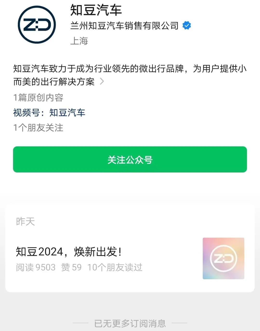 “知豆汽车”公众号于2023年12月26日注册,昨日(3月7日)发出第一条消息官宣重启