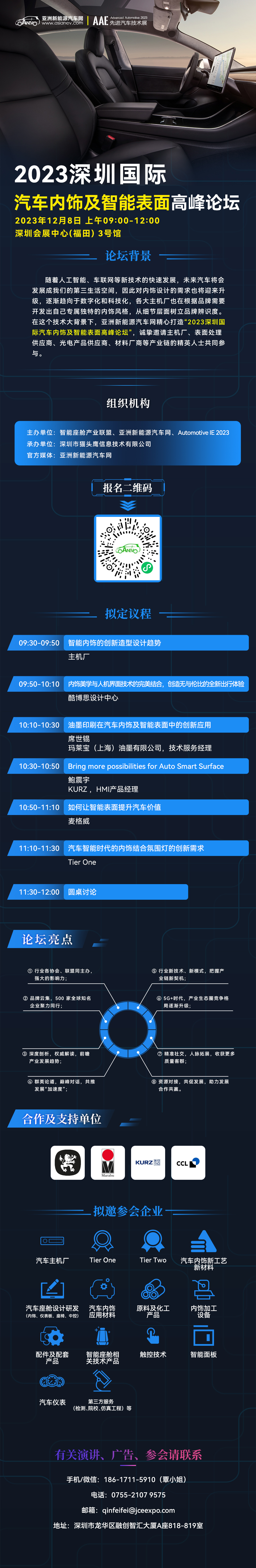 2023年12月6日-8日,竟成展览联合亚洲新能源汽车网及智能座舱产业联盟将在深圳会展中心(福田)·3号馆举办2023第三届深圳国际先进汽车技术展览会,展会同期还将在12月8日举行2023深圳国际汽车内饰及智能表面技术高峰论坛,共话行业现状,展望未来机遇。
